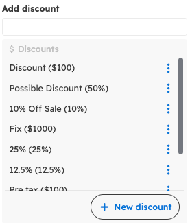 From here, you can search for and select an existing discount, or you can create a new discount by clicking on the blue "New Discount" button. You can also edit or delete an existing discount by clicking on the three dots to the right of the discount.