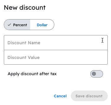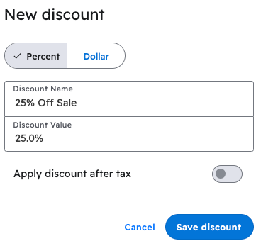 - At the top of the menu, you can decide if you are applying a discount as a percentage or dollar amount.
