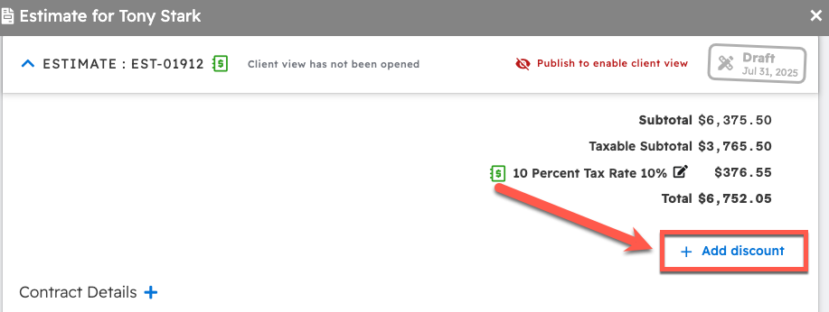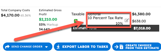 You can add discounts and tax rates to an estimate, invoice, or change order using the button at the bottom of the estimate.