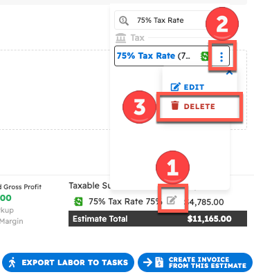 To delete an unwanted tax rate, open up the tax menu by selecting the gray pen-and-paper icon. Next, find the tax rate that you wish to delete and press the 3-dot button to the right of it. Select "Delete" from the menu.