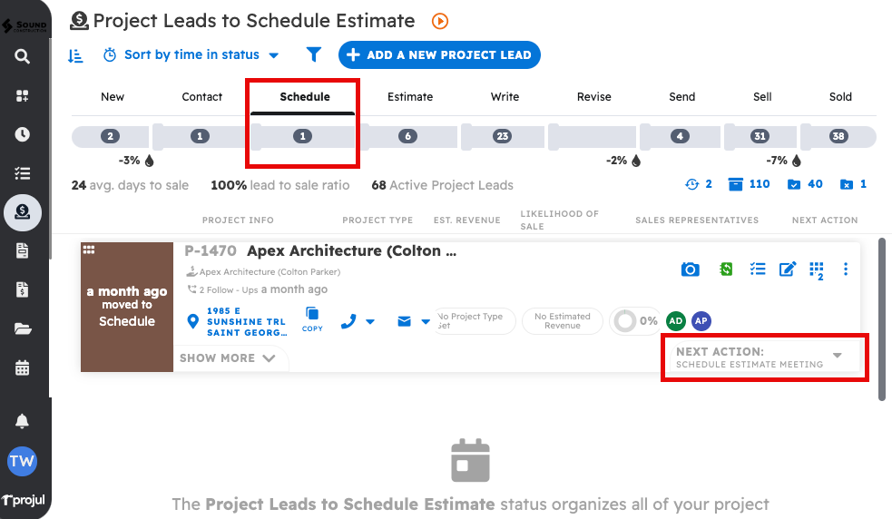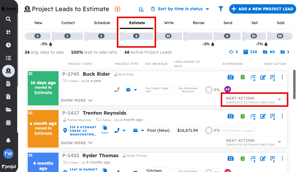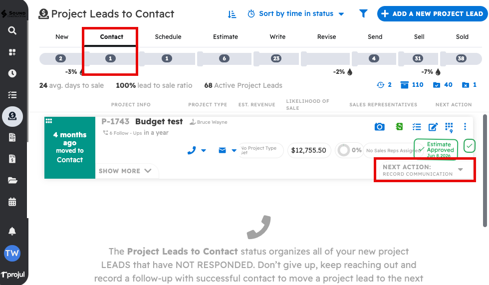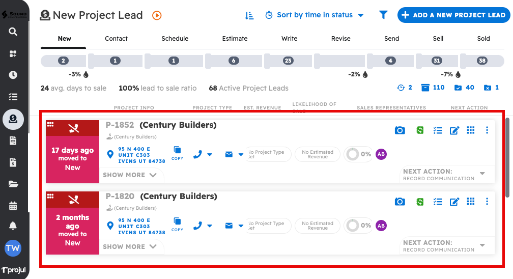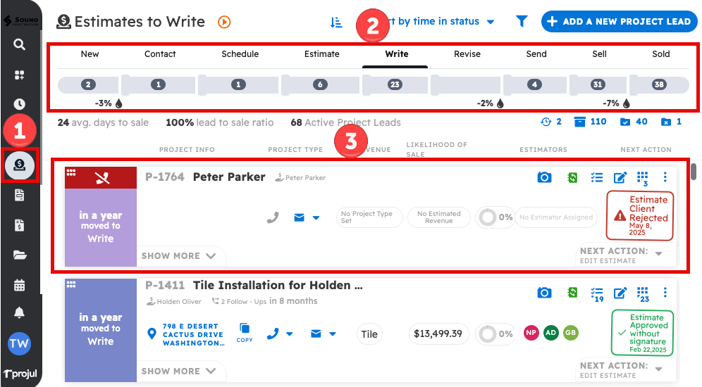 1. The Lead Pipeline is Projul's primary tool for managing, contacting, and estimating potential projects. You can navigate to the lead pipeline by clicking on the "Lead Pipeline" button in the left sidebar.