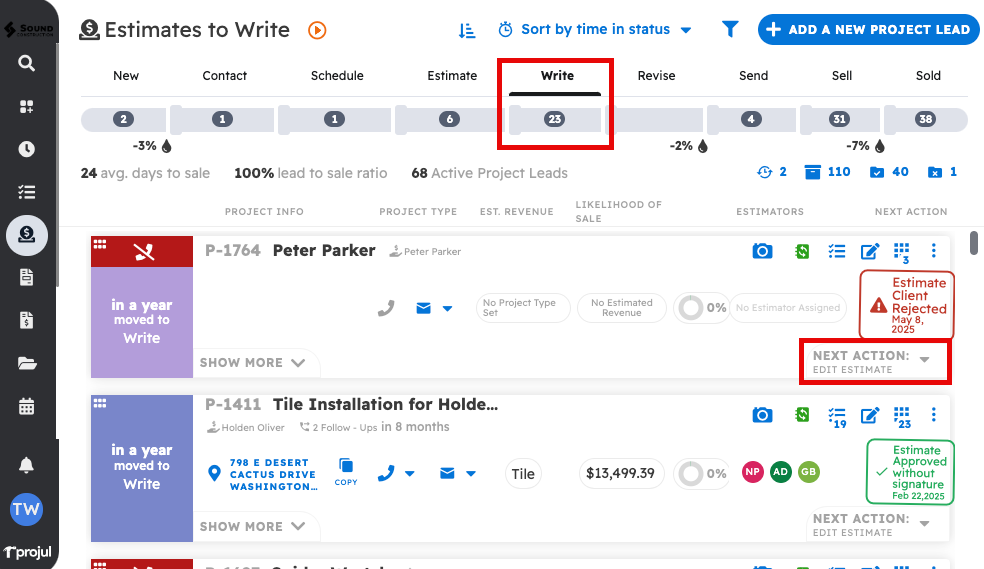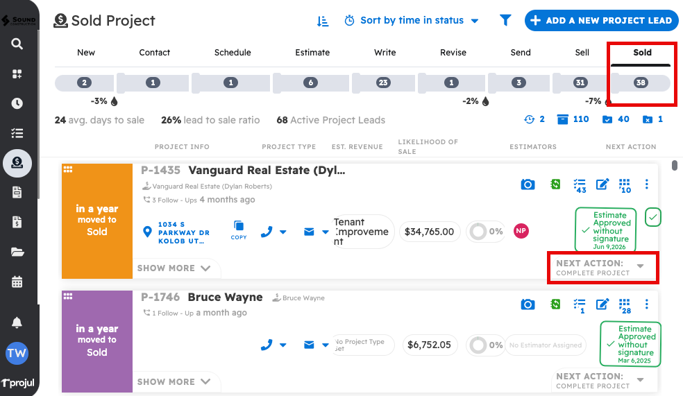 Clicking the "Mark estimate sold" button will start a project and move the lead to sold.