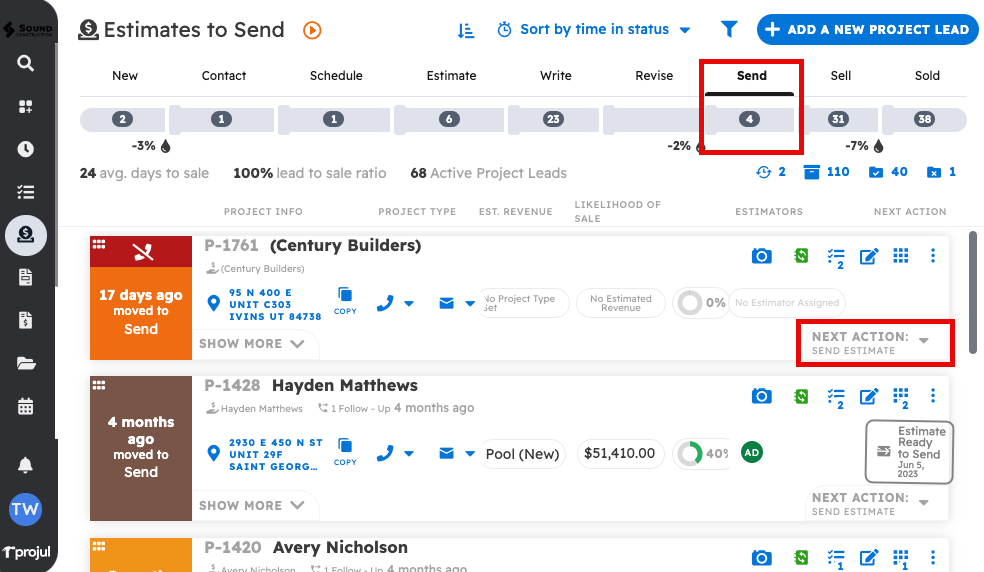 Marking an estimate “ready to send” will move the lead to send.