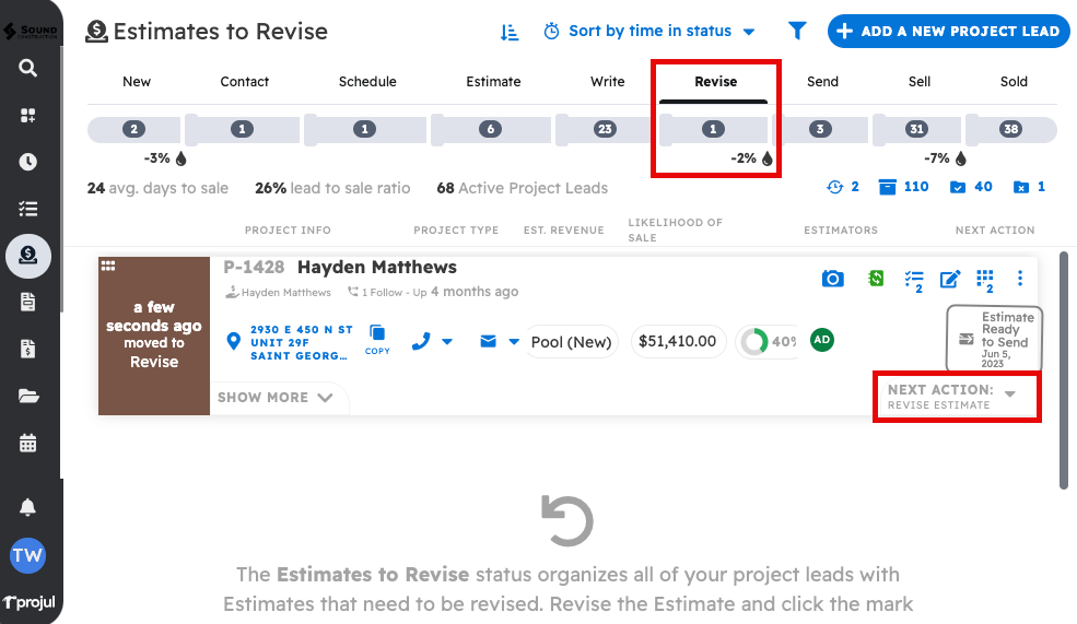 Clients clicking “request a revision” in the estimate will move the lead into revise