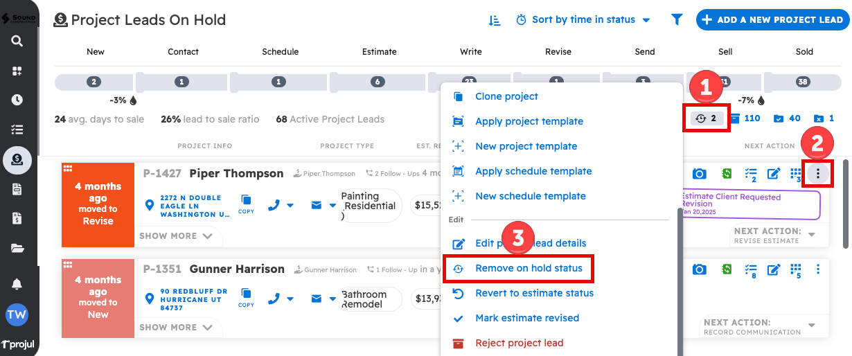 You can put a project on hold through the three-dot menu. Open the three-dot menu for a project and select "Place project lead on hold."
