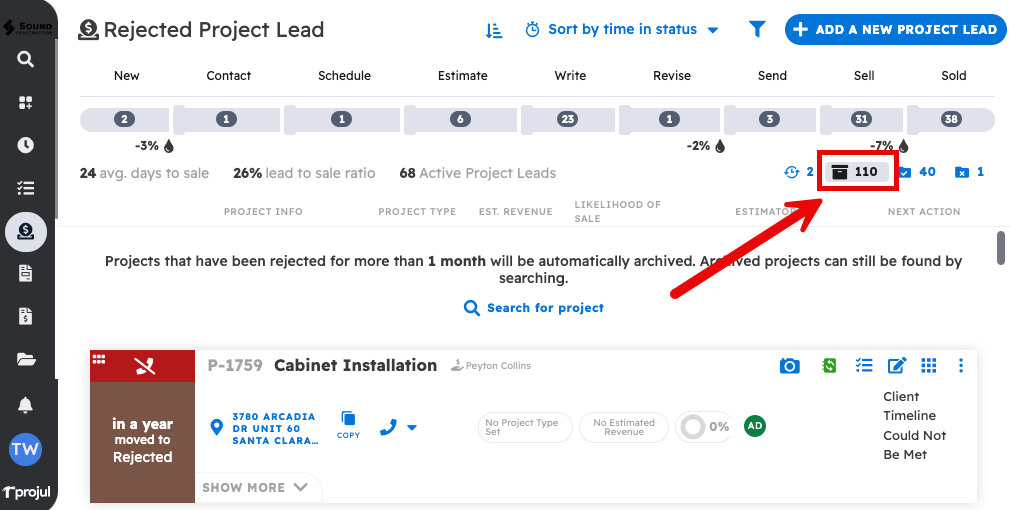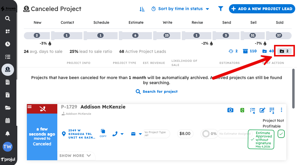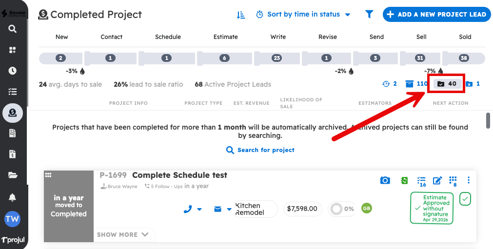 Please note that completed projects that have been inactive for more than one month will be archived. Archived projects will not be visible in the lead pipeline, but will still be visible from the search bar. If you would like to know more about archived projects, here is an article on them: My Project was Archived, How can I Unarchive it?