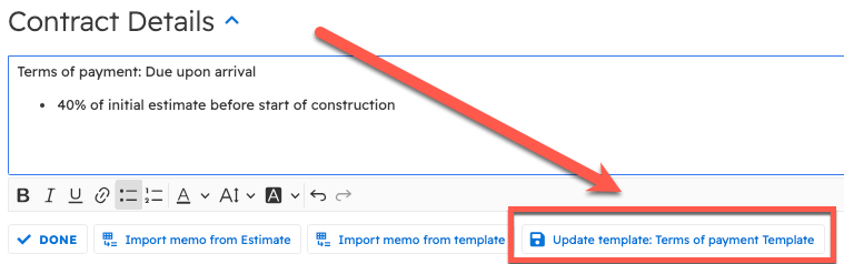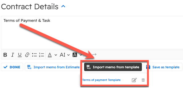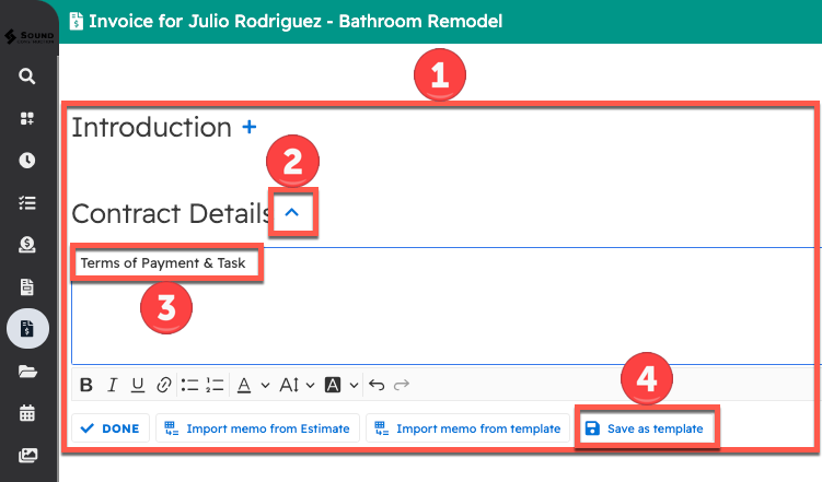 After typing in the introduction field or the contract details field on an invoice, there will be an option to save the text as a template to reapply it later.