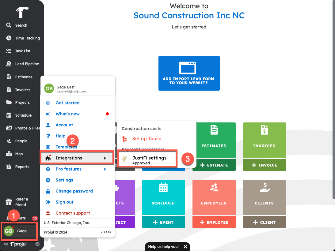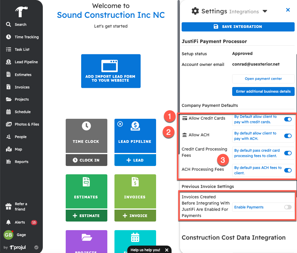 Once the JustiFi integration is activated, ACH or credit card payments can be enabled in integration settings. To navigate there: