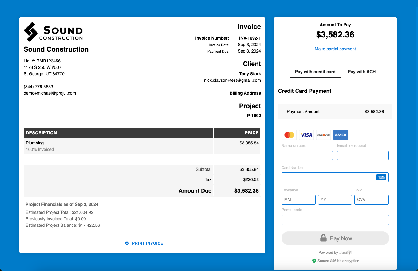 After payment processing is set up in Projul, clients can easily make payments directly from their invoices. When they open the invoice link, a payment box will appear on the right side of the invoice, allowing them to enter their payment details. Once entered, they can simply click "Pay Now" to initiate payment of the funds directly to your bank account.