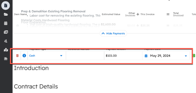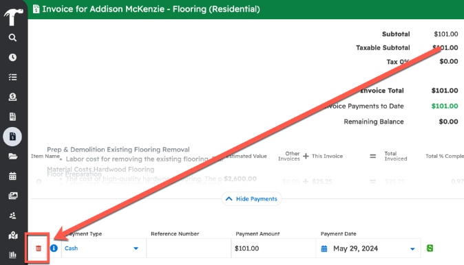 NOTE: If this payment was made through JustiFi, there will be no delete option. In that case, please contact Projul customer support (support@projul.com) to edit paid invoices.