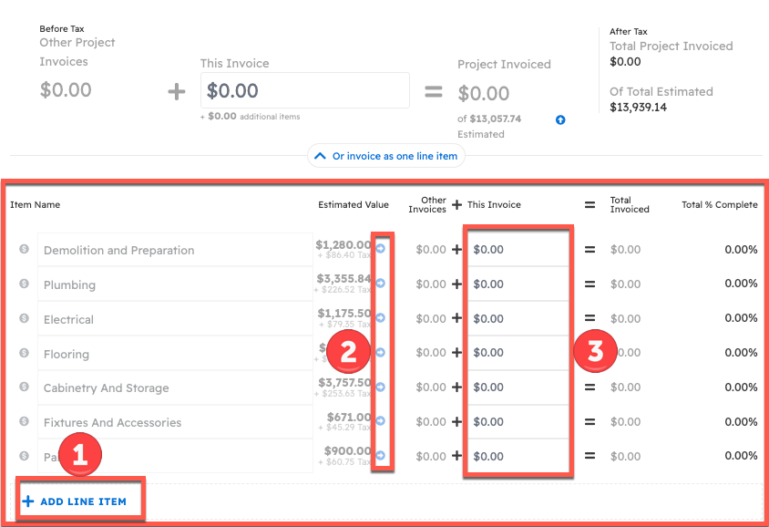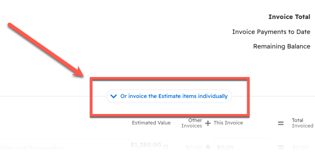 To edit estimate items individually, click on the "Or invoice the Estimate items individually" (which will change to "Or invoice as one line item" once selected).
