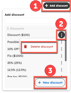 - Clicking on the three dot menu to the right of the discount opens an option to delete the discount.