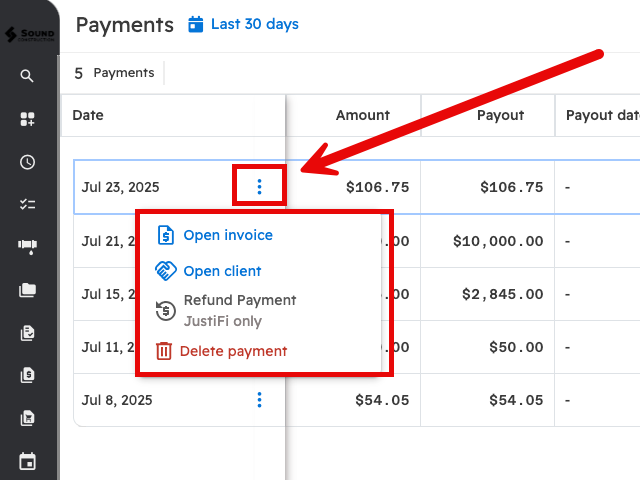 Additional information about each payment can be viewed by clicking the three dots to the right of the payment date. This will open a menu with the option to open the invoice, open the client, refund the payment (only for JustiFi payments), or delete the payment.