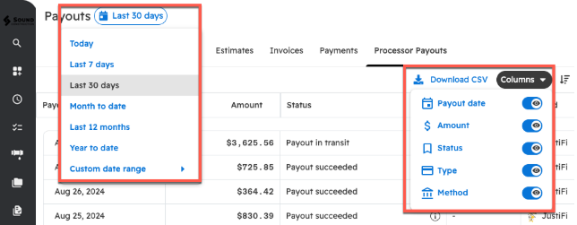 Similarly to the payments page, the payouts page has a date range that can be adjusted in the top left corner, as well as a "Columns" button in the top right that can be used to adjust the display information.