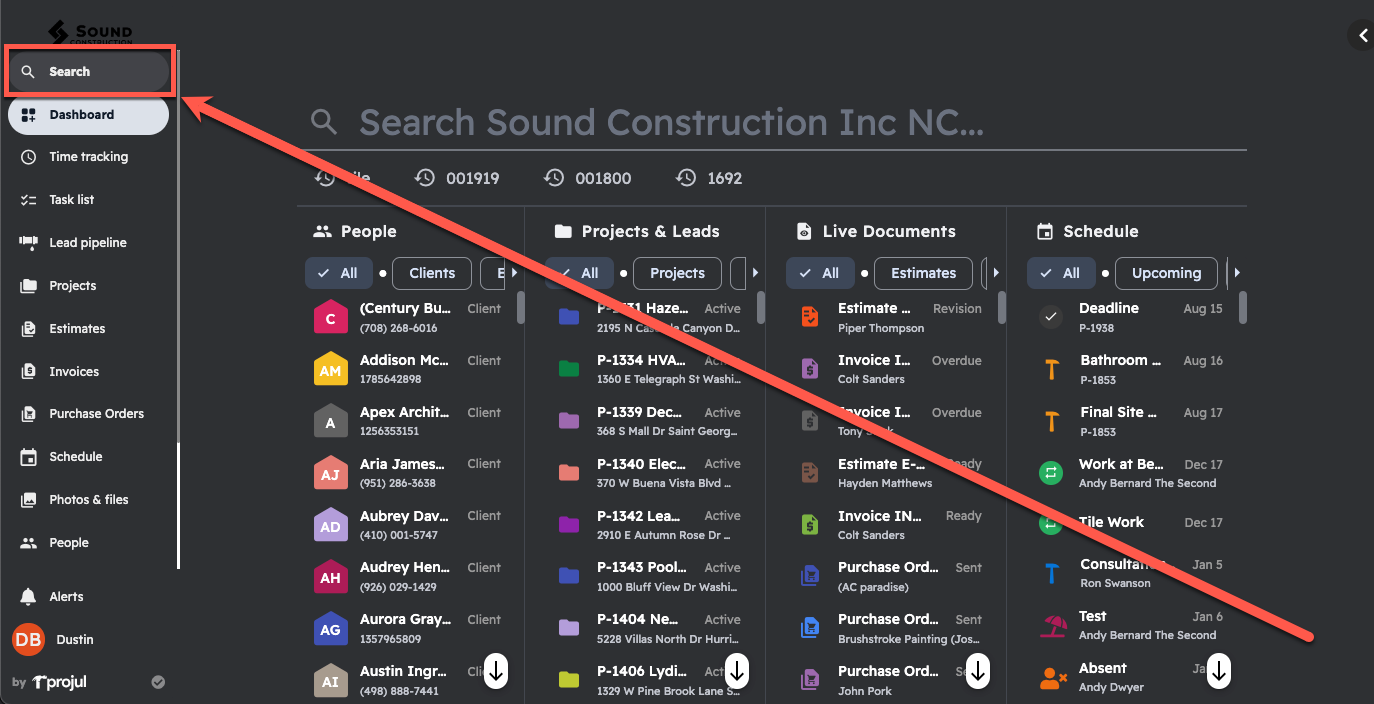 The search bar can find invoices within Projul, including inside archived projects. To access the search bar, click the "Search" button at the top of the side menu in Projul. Search options include: