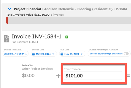 The default tax is set to the one added in the estimate, but it can be manually changed from here by clicking on the edit button next to the tax title.