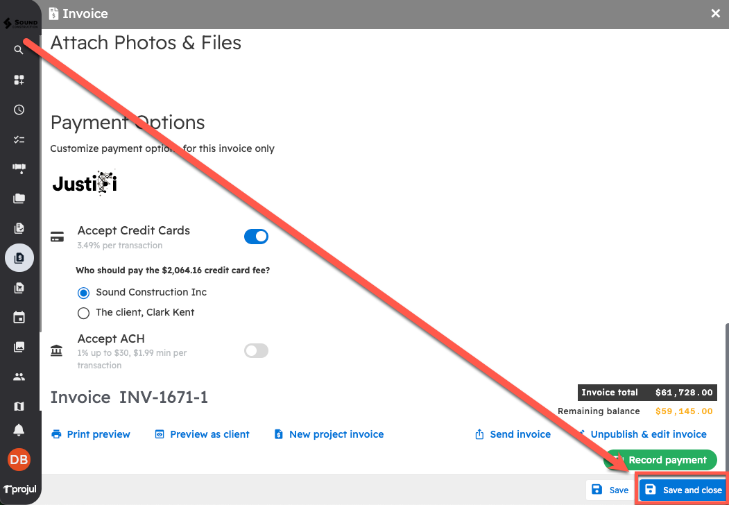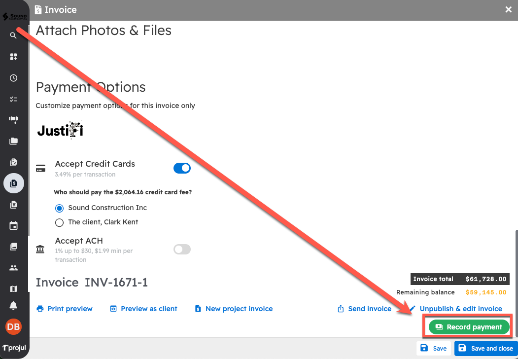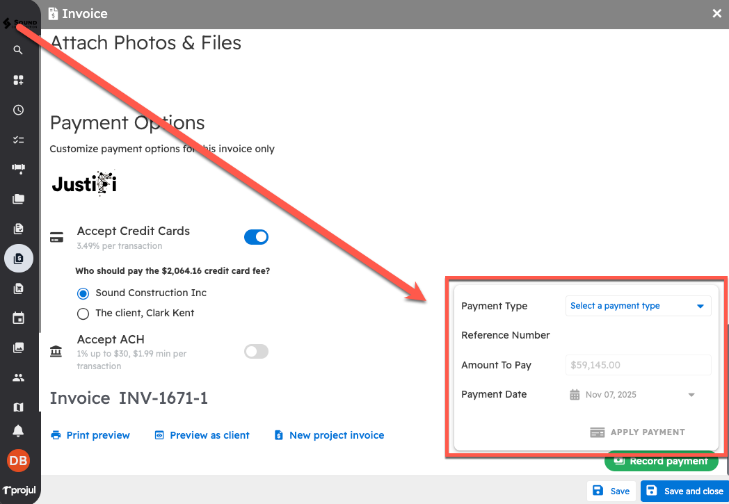 If payment processing through the JustiFi integration is set up, clients can make credit card or ACH payments on invoices in Projul.