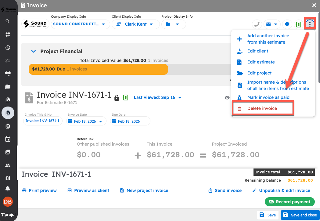 Navigate to an invoice from either the project, the estimate, the client, or the search bar.