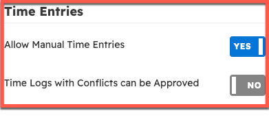 This account-wide setting determines whether or not it is possible to record a time log manually or approve a time log with a conflict. Even if this toggle is on, only employees with the appropriate permissions will be able to record time logs.