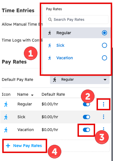 Pay rates can be edited from the pay rates section of time tracking settings, including:
