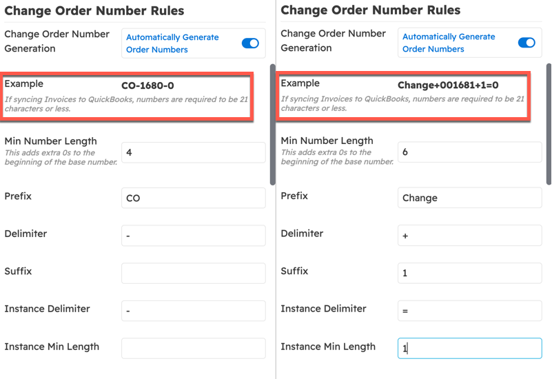 The example change order number will change as the settings are adjusted.