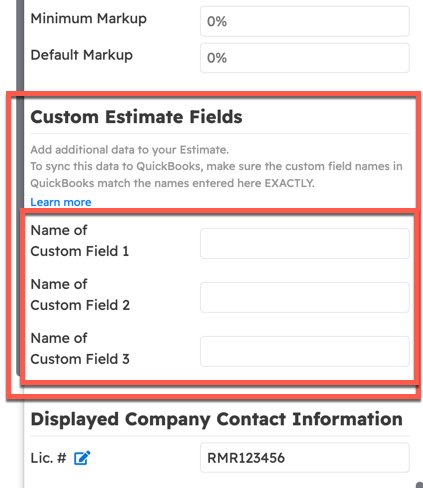 Custom estimate field settings allow three customized text blocks to be added to the estimate.