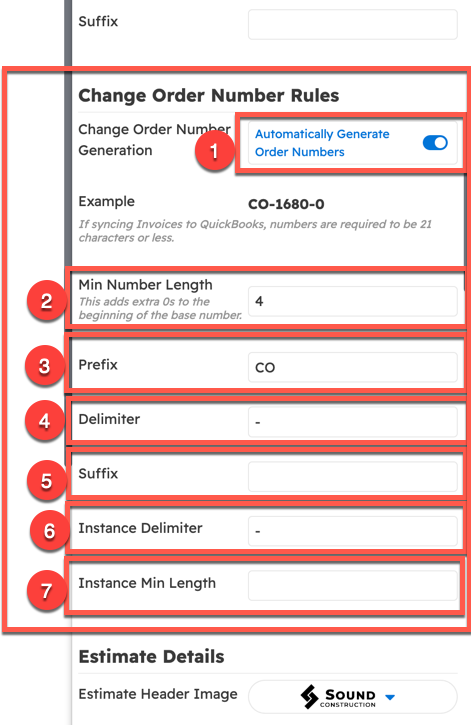 Change order number settings are similar to the estimate: