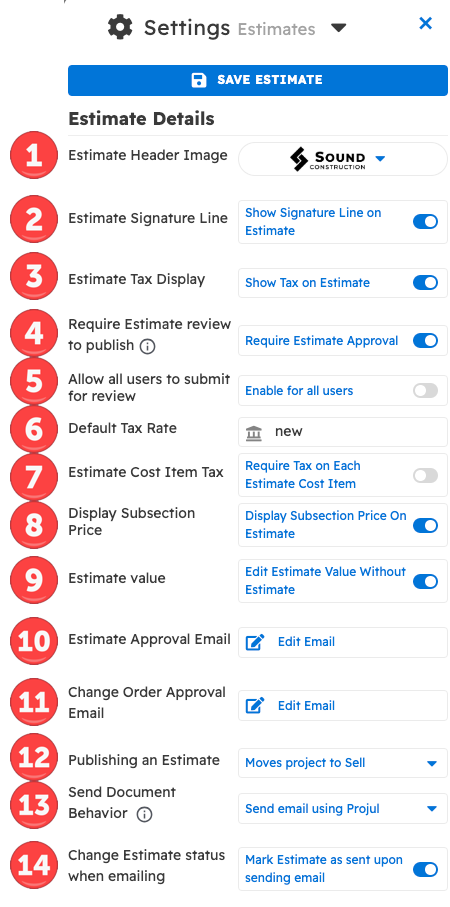 Various details of the estimate can be determined in the estimate settings (screenshot below):