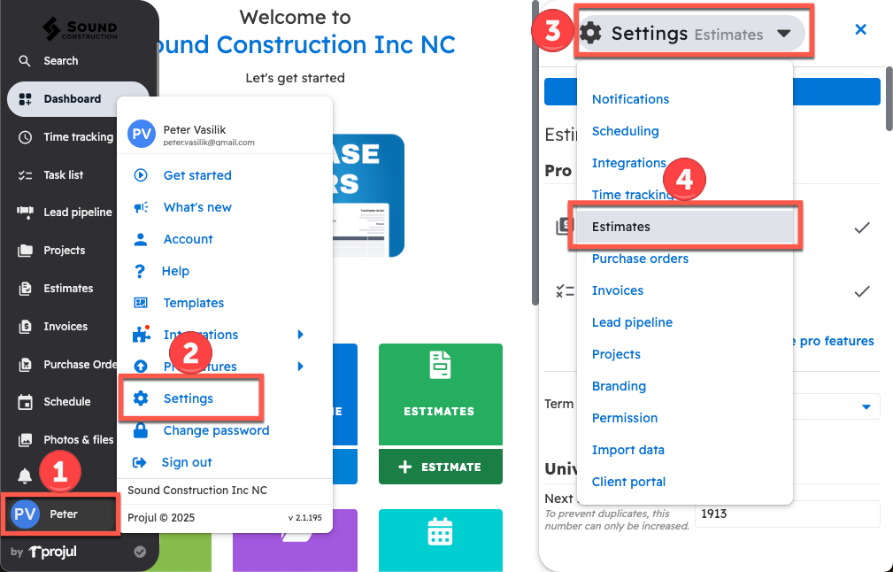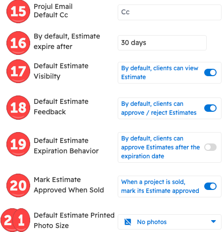 Projul has the following estimate number rules settings controls: