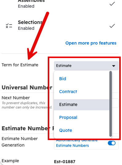 The "Term for Estimate" setting can be used to change every instance of the word "Estimate" in Projul to a different word. The estimate term options are:
