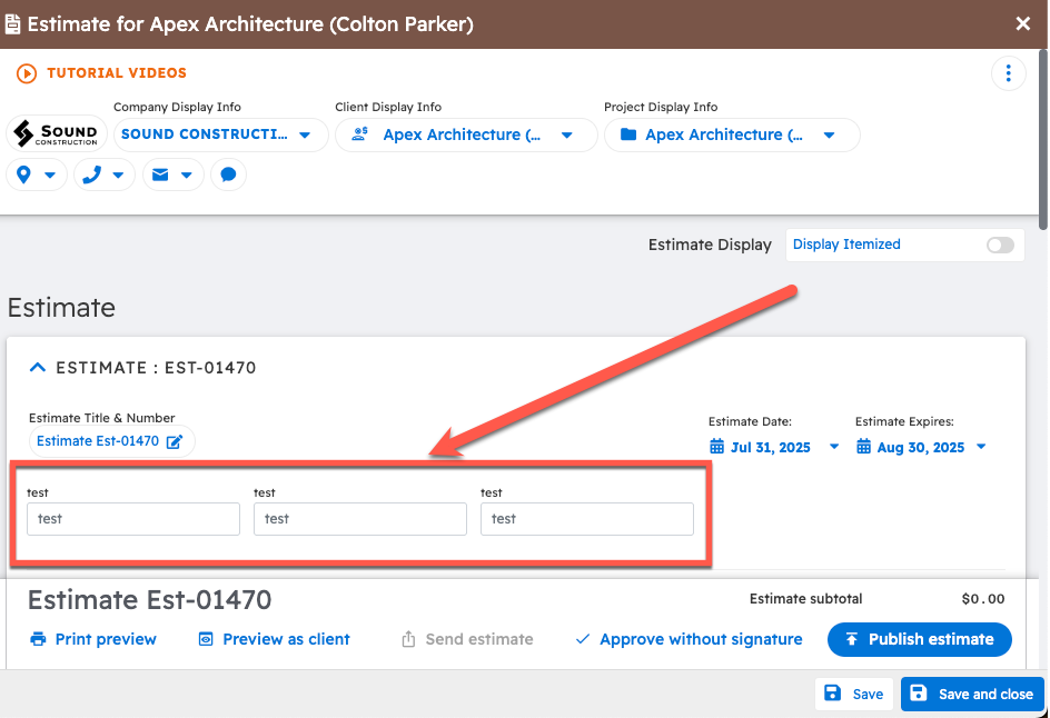 Custom fields are displayed as follows in the estimate:
