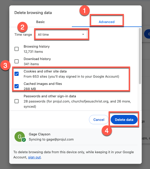 - Select the "Delete data" button to clear the browser cache