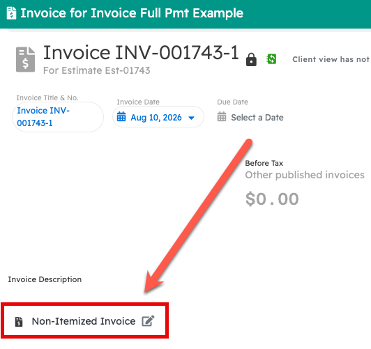 In Projul, non-itemized invoices show the billable amount as a single line item. Though non-itemized invoices in Projul display as one line, they are still billed from various cost lines in the estimate.