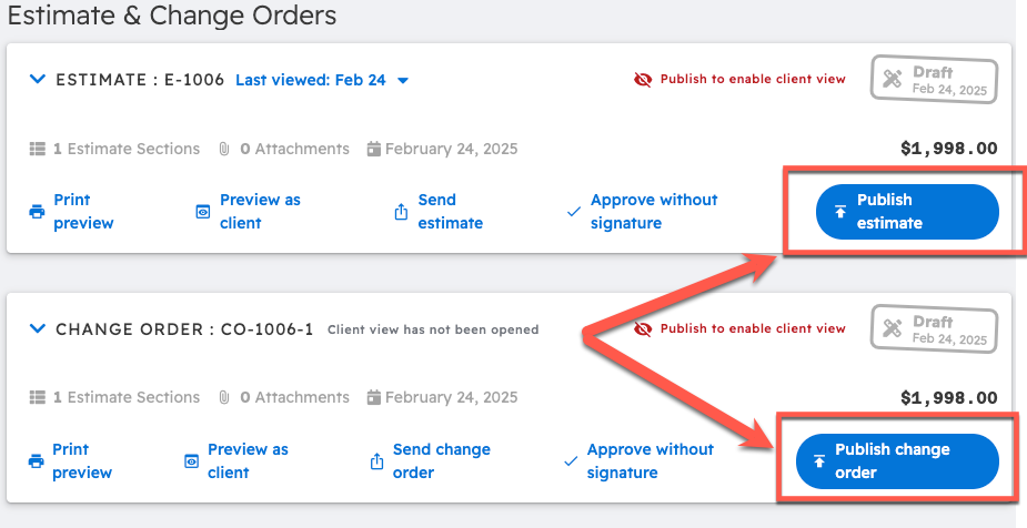 Publishing the estimate locks editing and allows clients to access the document. Change orders must also be approved before appearing on invoices.