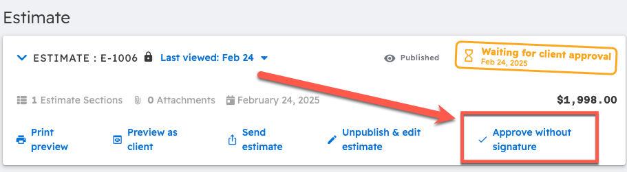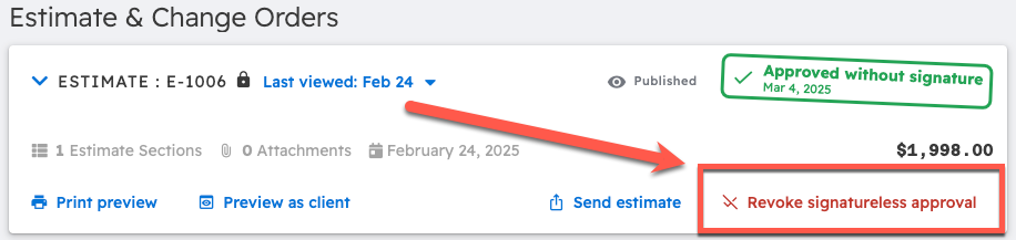 Change orders are the same, as they must be approved before adding them to any document. Both Estimates and Change Orders can be approved without a signature and have their approval revoked.