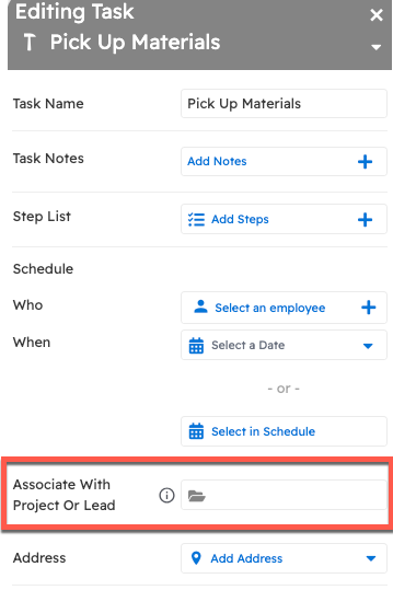 Something else to check is whether or not the task has been associated to a project. In the "Associate With Project Or Lead" field, type in the name of the project and select it from the list to tie the task to the project.