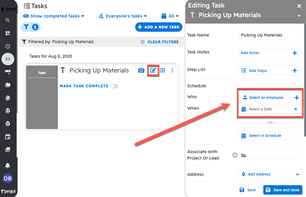 To check if a task has been given a date, navigate to the Task List and use the filter at the top right to find the task. Then, click the edit button and open the schedule portion of the task editor.