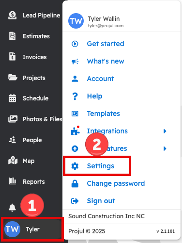 Open the user menu by clicking on the button with your initials in the bottom left corner of the Projul main screen. From this menu, select "Settings."