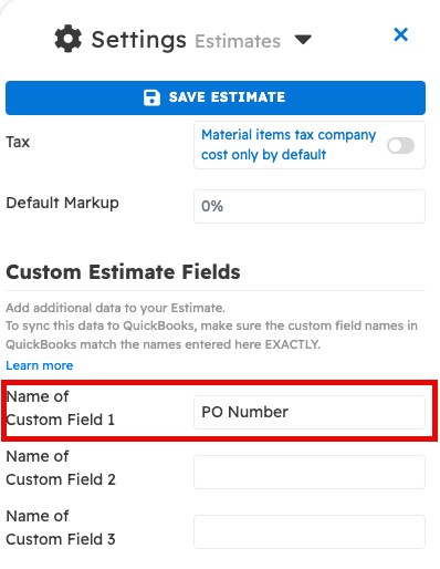 Custom fields can be added to Estimates by inputing a label to the desired field within the "Estimates" section of the general settings sidebar. Once created, they will show up on your Estimates, where you can enter the custom field data. These custom fields can be transferred over to QBO when syncing an Estimate between the two systems.