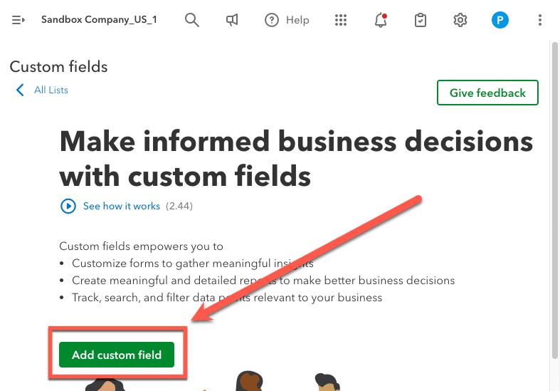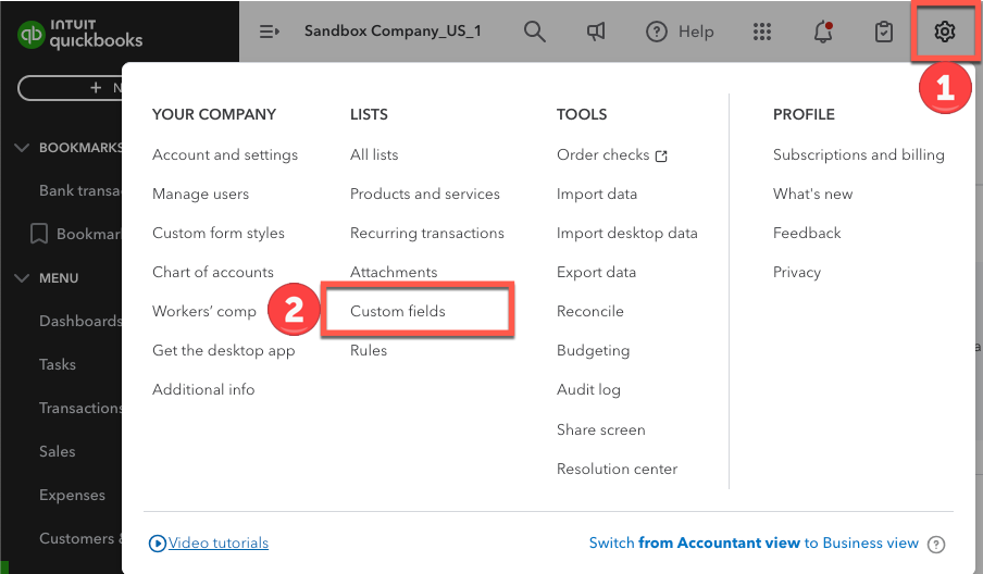 To sync these custom fields to your QuickBooks Online (QBO) account, first log in to QBO and click the "cog/gear" icon in the top right corner of the screen.