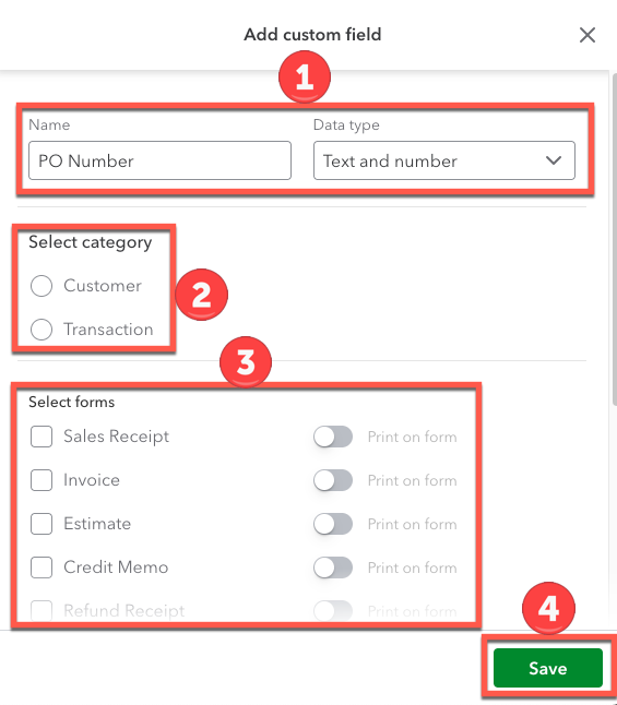 Enter the same custom field in QBO that EXACTLY matches what was entered in Projul. You can use the checkboxes to show these labels internally and/or publicly.