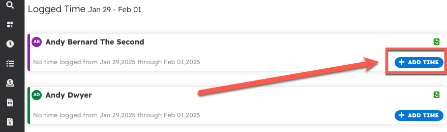 To add a new time log, click the blue "+ Add Time" button found at the bottom right corner of each employee's time log.