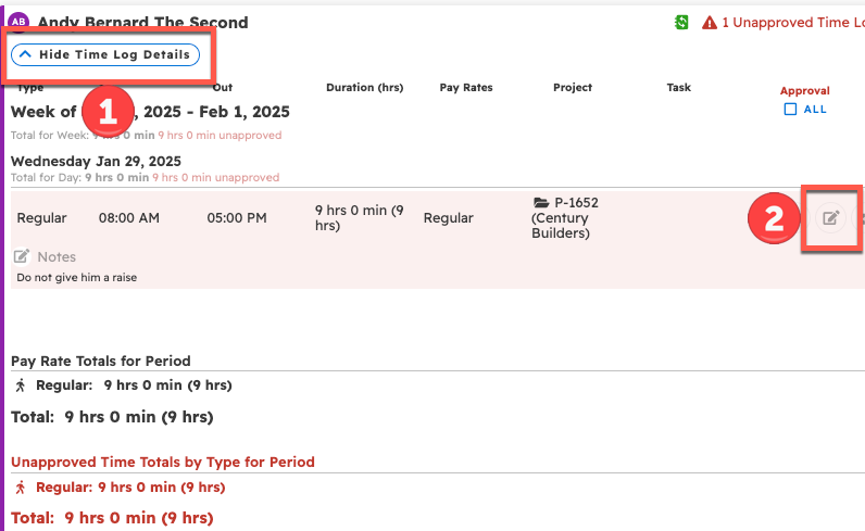 To edit an existing time log for an employee, click the "Show Time Log Details" button.