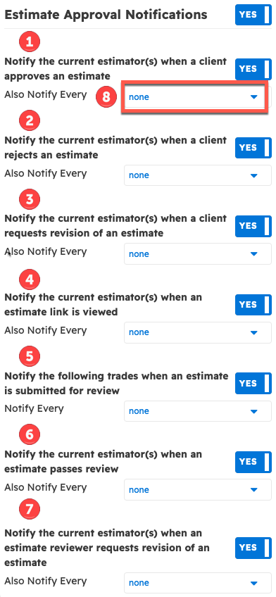 The estimate approval notifications settings let you decide whether to notify the estimator when: