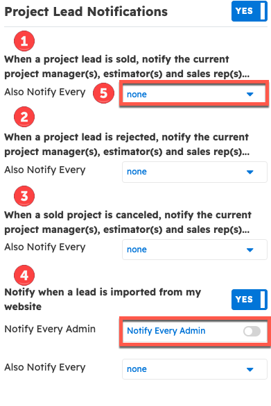 Project lead notifications let you decide if the current project manager, estimator, and sales representative for a project are notified when:
