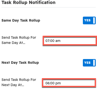 Task rollup notification settings allow creation of an automated rollup for same day and/or the next day's tasks. The time that rollup notifications will be sent can also be adjusted.