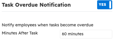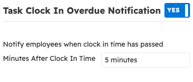 Task clock in overdue reminder notifications send a reminder if the user has a scheduled task that they do not clock in to. The wait time before this reminder can be adjusted.