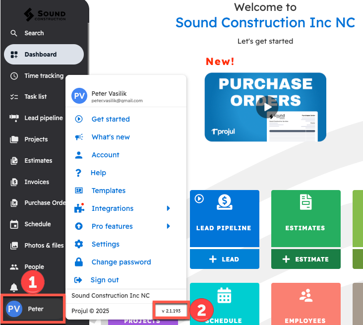 2. This will open a pop-up menu that shows the build number of Projul in the bottom right corner
