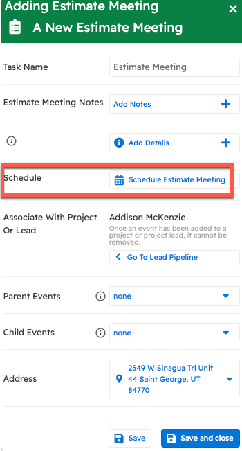 It will bring up a new Estimate Meeting task. You can change the name, add notes for the estimator to view later, and, of course, schedule the estimate meeting by clicking the corresponding button.