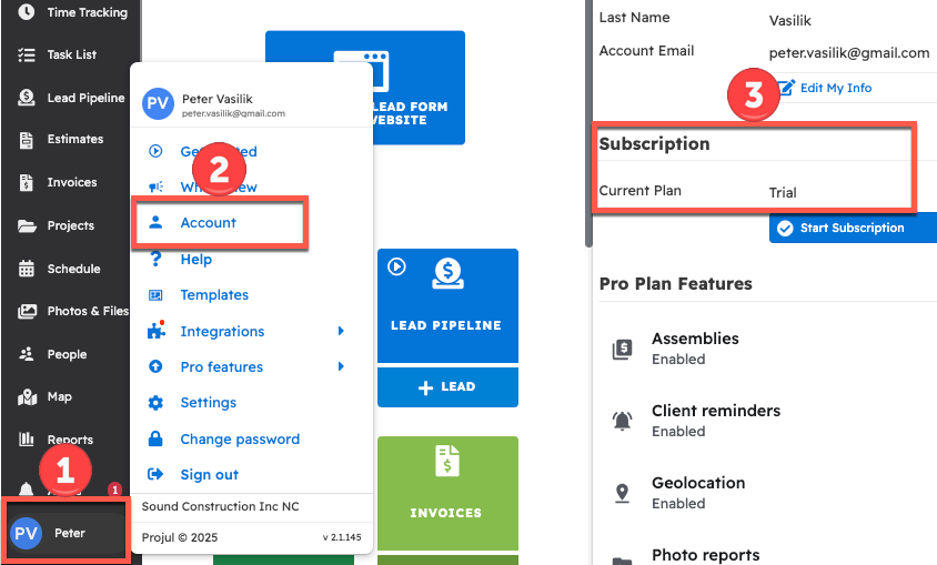To view the current plan, click on the initials in the bottom left corner, then select “Account.” The active plan will be displayed on the right.